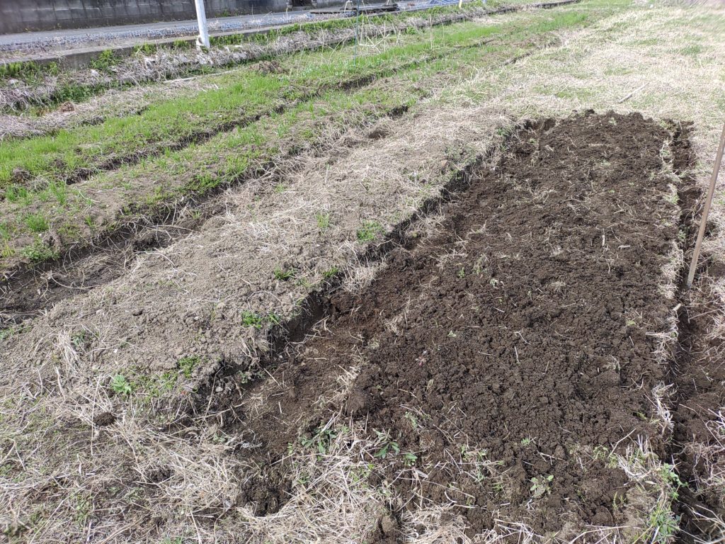 一番手前が最新の畝です。ちなみに、奥の方には小麦を植えてます。